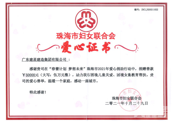 涓涓細(xì)流匯江海,點(diǎn)點(diǎn)真情綻春蕾。建星集團(tuán)積極響應(yīng)市婦聯(lián)號(hào)召,參與“春蕾計(jì)劃——夢(mèng)想未來(lái)”行動(dòng),通過(guò)廣東省天行健慈善基金會(huì)捐贈(zèng)善款五萬(wàn)元,助力慈善項(xiàng)目開(kāi)展。扶一株春蕾,爭(zhēng)一份春光;助一名學(xué)童,贏一片希望。讓更多春蕾兒童受到良好教育,實(shí)現(xiàn)人生夢(mèng)想,讓愛(ài)托舉起孩子們更加美好的未來(lái)!