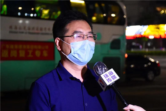 當(dāng)晚,珠海市住建局局長方小勇帶隊(duì)在體育中心集中點(diǎn)等候迎接返崗工人。車輛抵達(dá)后,方局第一時間了解路上的行車情況、對務(wù)工人員返崗表示歡迎、感謝他們?yōu)橹楹5某鞘薪ㄔO(shè)做出貢獻(xiàn),并叮囑大家一定要做好防疫措施,保護(hù)自己、保護(hù)身邊人,共克時艱、迎接春暖花開。
